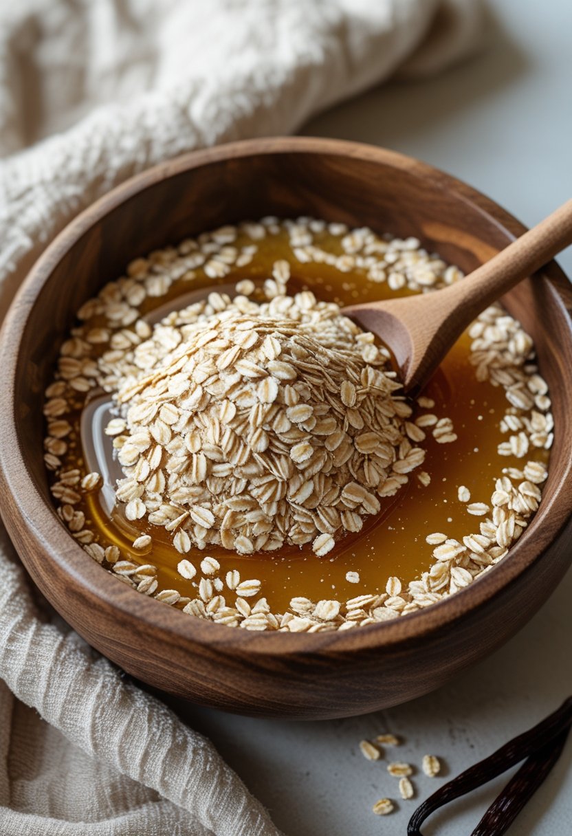 - Mix the ground oatmeal with honey, vanilla extract, and melted coconut oil.