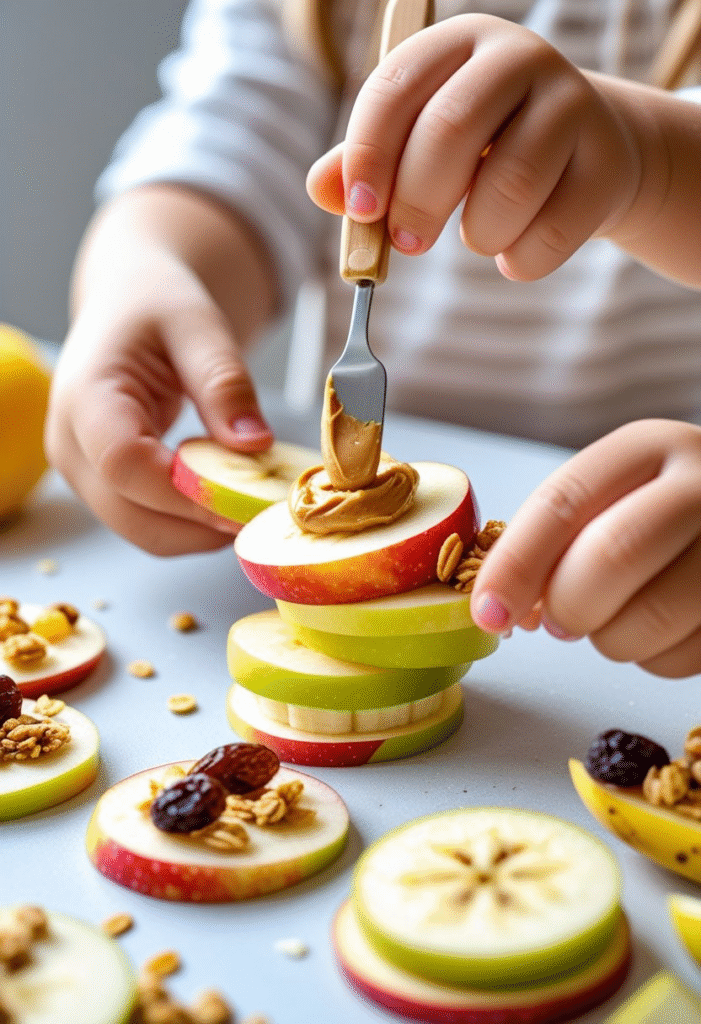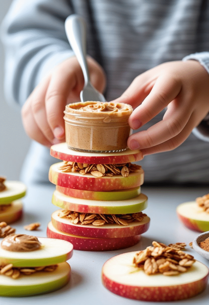For a fun twist on a classic snack, slice apples into rounds and spread almond butter or peanut butter between the slices. You can even add a sprinkle of cinnamon or granola for extra crunch.