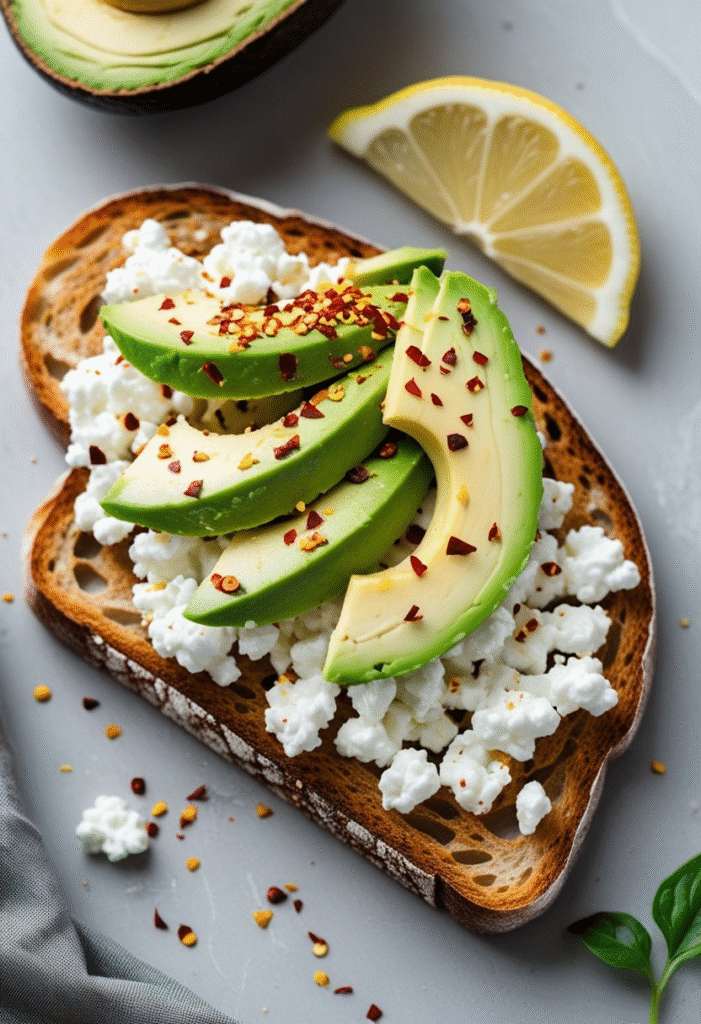 Smear cottage cheese onto toasted sourdough and crown it with ripe avocado slices. Sprinkle chili flakes, lemon juice, and black pepper for a punchy finish. A perfect balance of protein, healthy fats, and fiber.