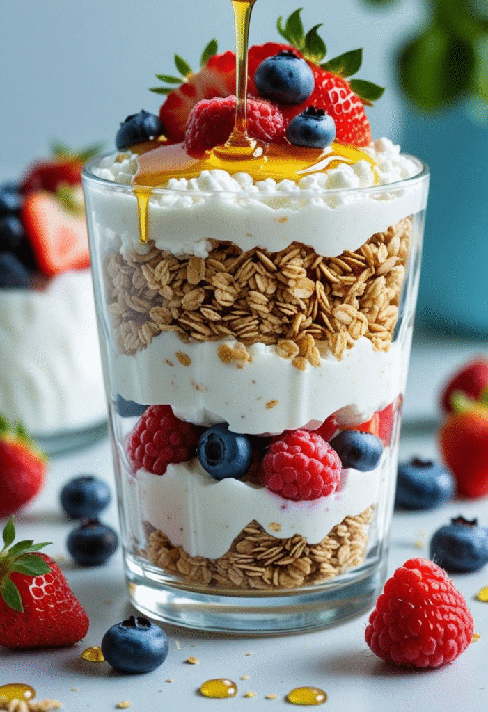 Layer cottage cheese with Greek yogurt, strawberries, almonds, and honey. This parfait feels like dessert while keeping you full and energized throughout the day.