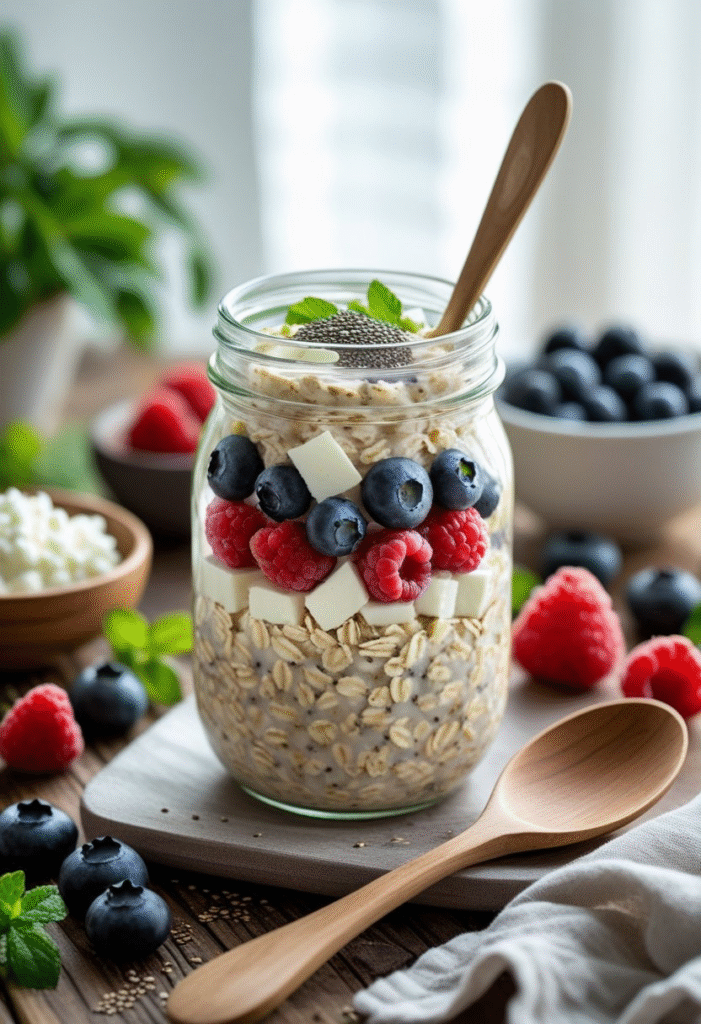 Combine oats, cottage cheese, almond milk, berries, and protein granola in a jar. Refrigerate overnight for a ready-to-eat, protein-rich breakfast.