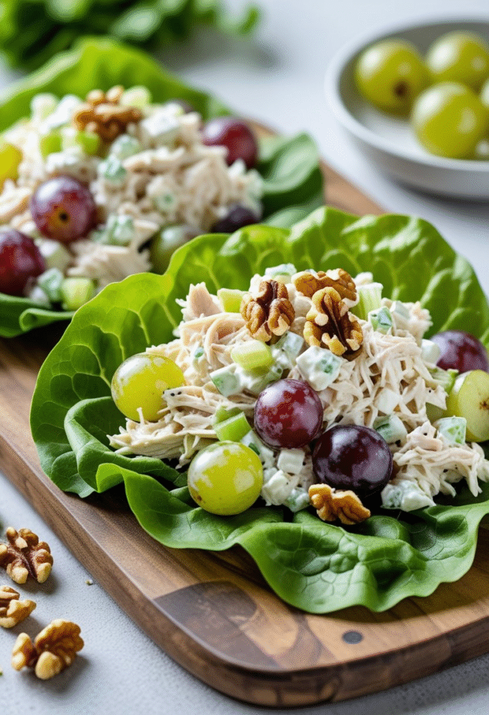 Shred cooked chicken and mix with cottage cheese, grapes, walnuts, and celery. Spread on lettuce wraps for a crunchy, refreshing, and filling lunch.