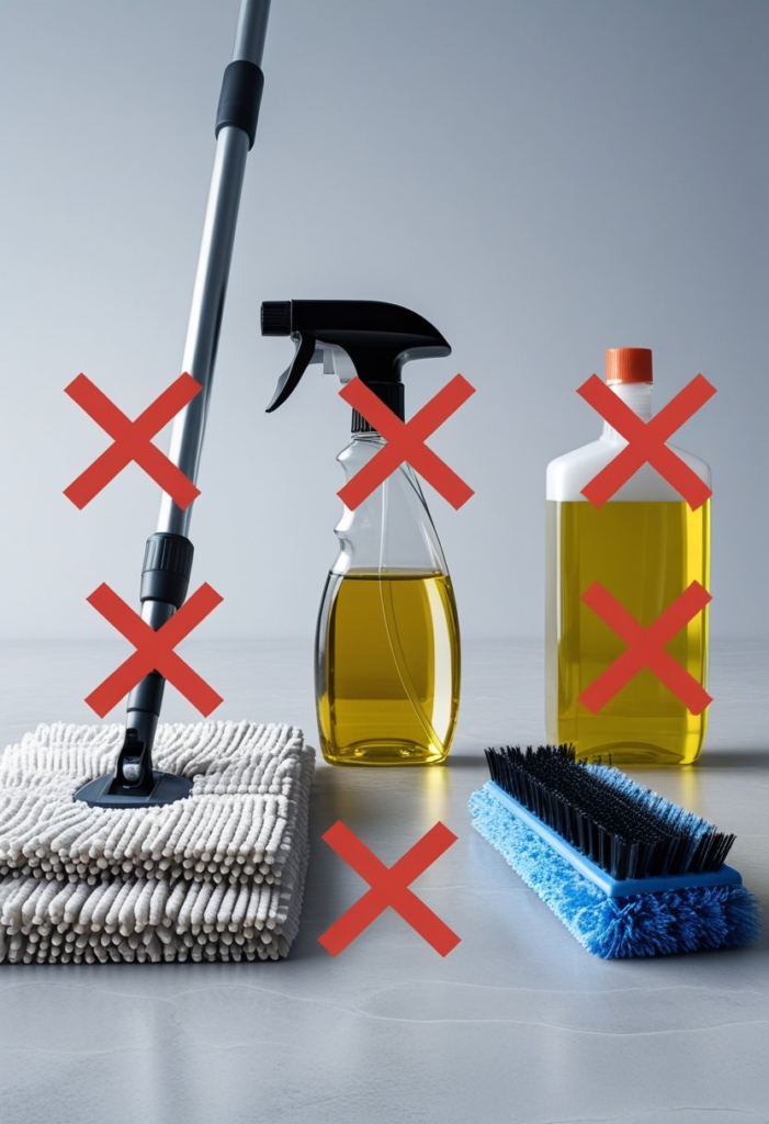 Avoid soaps or cleaners with oil, polish, or wax. They might make the floor shiny temporarily, but residue builds up and eventually dulls the surface.