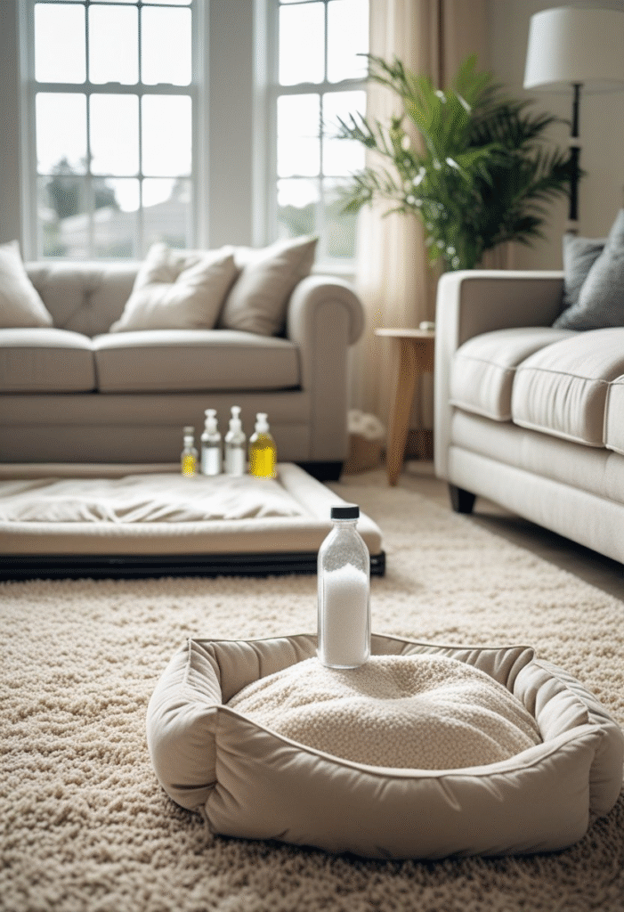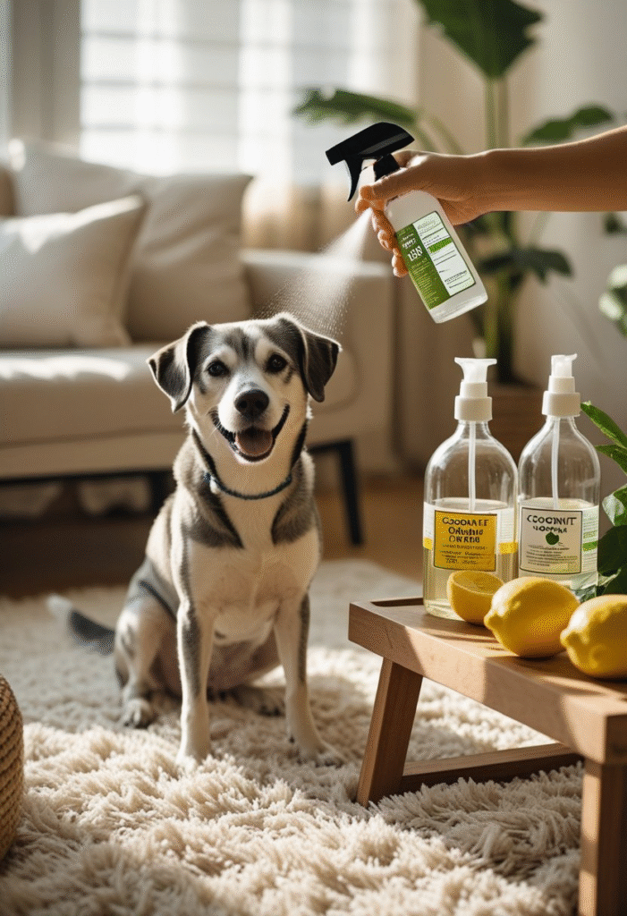 Spray lightly on fabric surfaces—avoid soaking. Essential oils must never be applied directly to pets, but using them in diluted home sprays is generally safe.