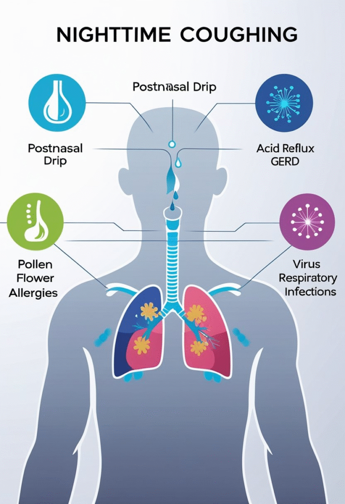 - Respiratory Infections: Conditions like the common cold, flu, or bronchitis can lead to persistent coughing that worsens at night.